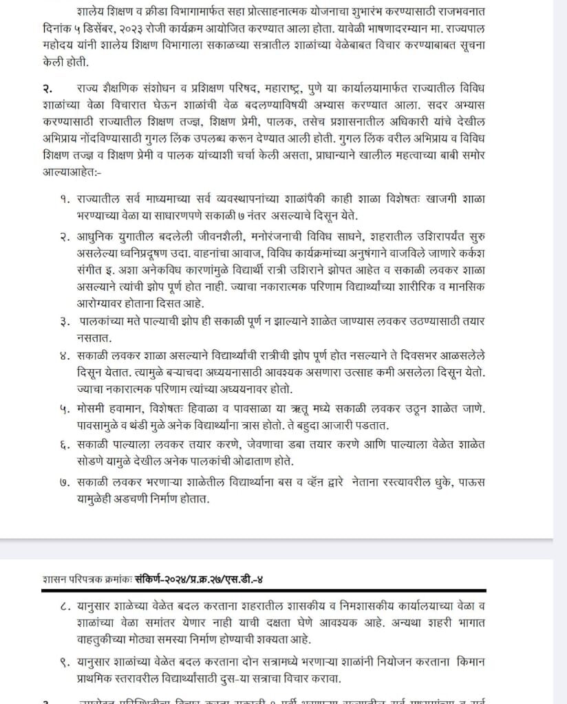 शालेय शिक्षण व क्रीडा विभागाने ०८ फेब्रुवारी २०२४ रोजी जारी केलेल्या शासन निर्णयानुसार (G.R.), पूर्व प्राथमिक ते इयत्ता ४थीपर्यंतच्या सर्व वर्गांसाठी थंडी, धुके आणि मुलांच्या आरोग्याच्या दृष्टीने शाळा सकाळी ९ नंतरच सुरू कराव्यात, असे स्पष्ट नमूद आहे.